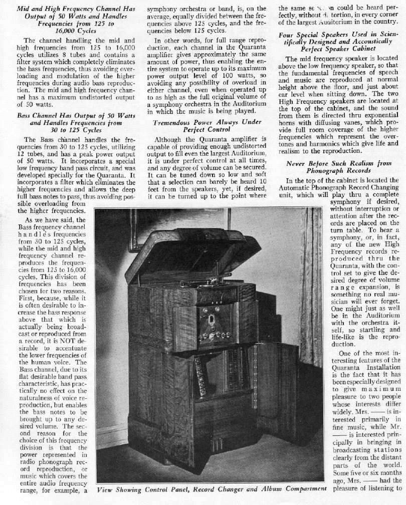 I am eighty and retired after having spent my whole life in the electronics business. I used to travel - too much!! - throughout the world and went very often to the U.S. I collect old radios and have been a passionate reader of the ARC Bulletin since the beginning. In 1987, I read an article written by Norman Braithwaite in the July issue Vol 4 in which he described a 48-tube E.H. Scott radio. It stung my curiosity and I decided to visit him. He showed me a gorgeous radio (48 tubes - 6 chassis - 6 speakers), an E.H. Scott Quaranta he had rebuilt. The only information he unfortunately could give me was a drawing by Roy Burnett corrected by Norman showing the location of the tubes of the tuner. There was also another simplified drawing describing another chassis for a crossover with two separate channels: one for mid and high frequencies 40 watts output, and handling frequencies from 125 to 16,000 cycles, the other for low frequencies, also 50 watts, and handling frequencies from 30 to 125 cycles. The power amplifier was similar to two Scott Imperial amplifiers - side by side. In his article, Norman showed how to connect all chassis together. I gathered the information, took some pictures and came home. I am a Scott collector and bought my first one, a Philarmonic, from Bruce Mager of Waves in Manhattan. I bought many Scotts and many other sets since. After visiting Norman, I was very intrigued by this Quaranta. A few months later, I went up to my country house and decided to look through my stock of Scott's and other radios. I found a separate chassis. It was a Scott tuner looking like an Imperial, but the tubes were set in a different way that in the other chassis. After going through a deep study, I realized that the chassis had two 6C6's, one 76 and one 6B7 plus two 6E5's. The difference with the Braithwaite chassis was that the two 6A7's, one 6C6 and one 76 were for the volume expander as indicated on a drawing sent by John Terrey of ARC, and looked like a baby Quaranta. On my chassis, there was one 6B7 and one 6C6 acting as a "scratch suppressor", but no 6A7? I immediately thought my chassis was a Quaranta, and remembered how I had got it. At that time, my brother-in-law was the importer of Crosley refrigerators and radios in France. One of his good friends, another importer, Mr. Martelière used to import Scott radios. He had probably given his chassis to my brother-in-law who gave it to me. I was convinced that the chassis was made in 1936 for the French market because it had a longwave band - X band - like some American radios. At that time, there were some interesting things to listen to on the 200kcs band. The most important was the DROITWICH 200kcs for the news, and up until for 3 or 4 broadcasting stations like France Inter or Europe I Radio Luxemburg, etc. I was lucky enough to meet, sometime later, another Scott collector, Kent King. I visited him and he very kindly gave me the explanation of the two 6A7's. These tubes are not on the tuner chassis, like the Braithwaite chassis but on the crossover chassis for the volume expander amplifier. Therefore, I realized that the real Quaranta had the "expander" and the "scratch suppressor" on the tuner with two 6L7's on the crossover. A long time after a meeting in Elgin Illinois, I met John Meredith (a Scott specialist) who introduced me to Mr. Marvin Hobbs, a former Scott engineer. Marvin gave me an original drawing of the crossover. It shows that the two 6A7's have been changed for two 6L7's due to the difficulty of matching two 6A7's. In the Scott instructions leaflet for the installation and operation of the "volume expander unit" made for the Imperial, they say that you must make sure to use carefully selected and matched tubes, and the replacement should be secured by the laboratory!!!