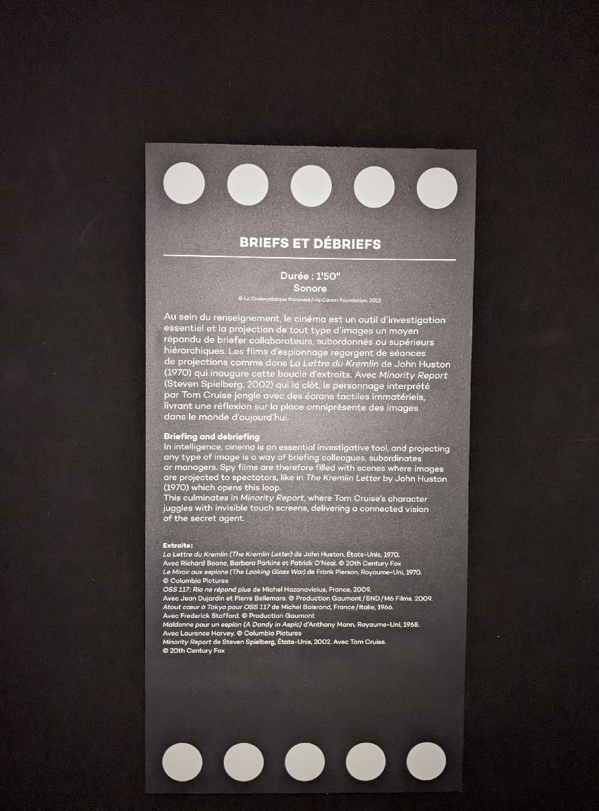 Lors de notre voyage en France au début de mai 2023, nous avons assisté à l'exposition Cinématèque "Top Secret - Cinéma et espionnage" tenue à Paris entre octobre 2022 et mai 2023. Vous trouverez ici-bas quelques photos prises lors de notre visite le 3 mai. Simplement cliquez sur une photo pour la voir en plus grand format.
